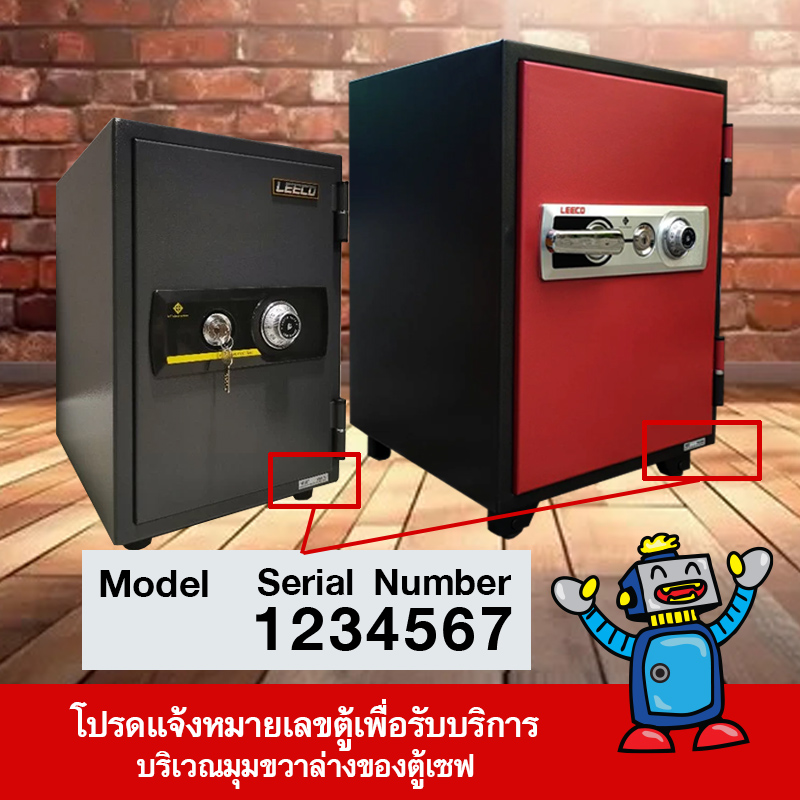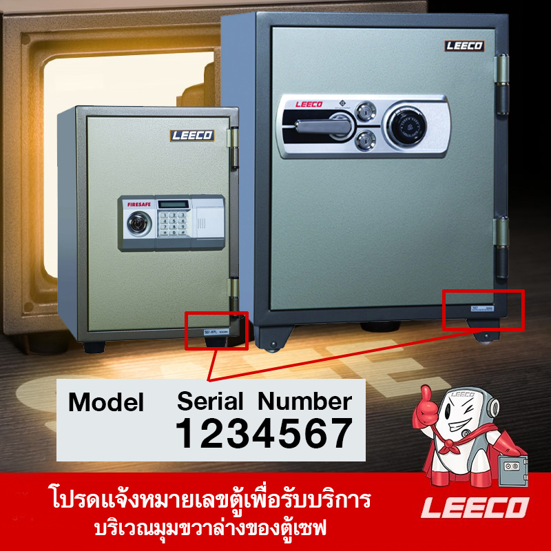 ดูได้จากป้ายข้อมูลบริเวณมุมขวาล่าง ด้านหน้าของตู้เซฟ - แจ้งรุ่นตู้เซฟ